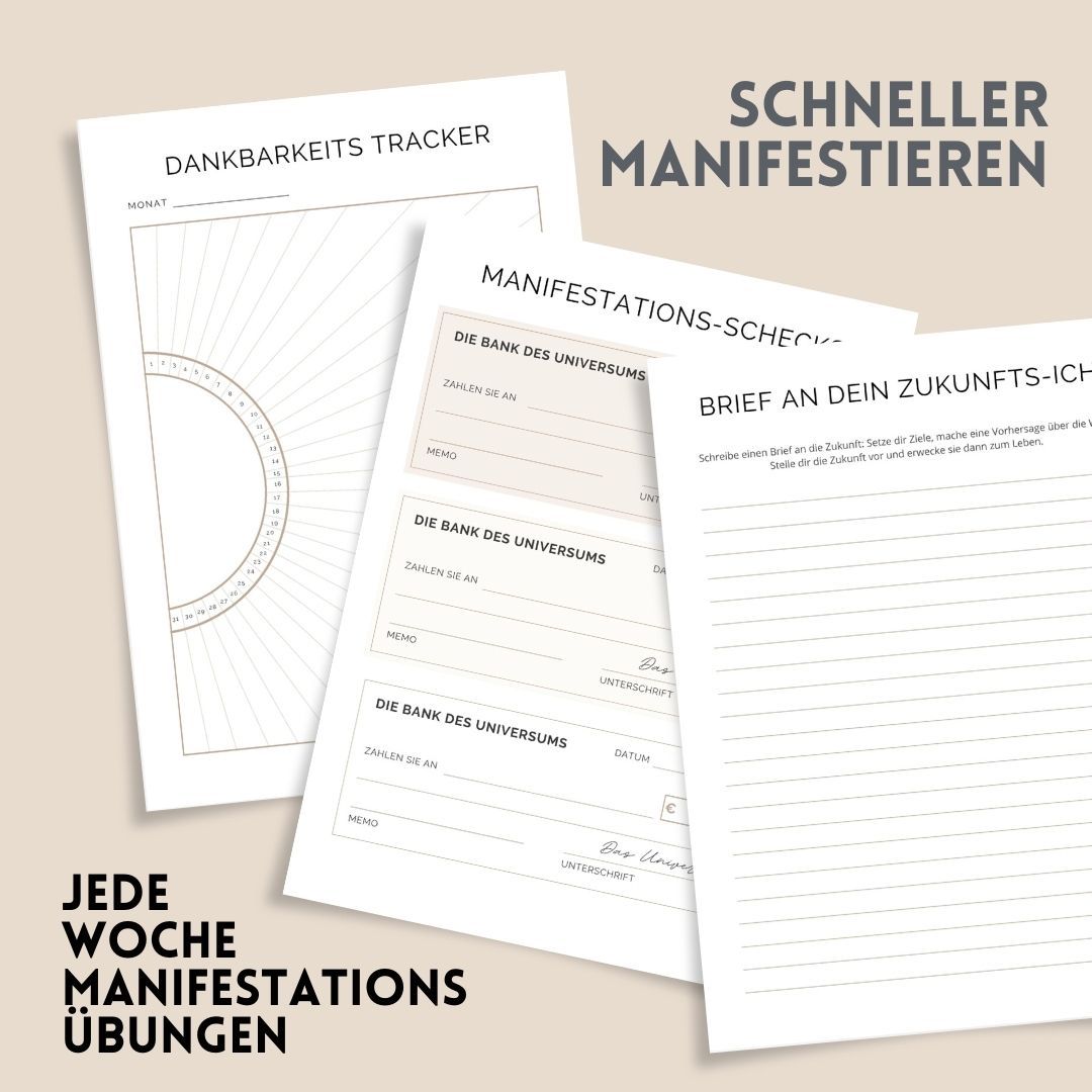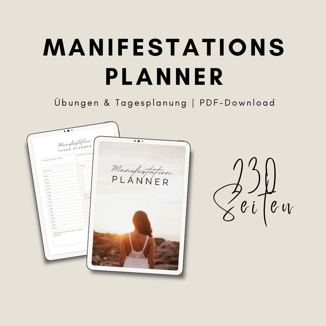 Unser Manifestations-Planner unterstützt dich dabei, zu verstehen, was Manifestation bedeutet, wie du gezielt Intentionen und Ziele setzt, einschränkende Überzeugungen überwindest, tägliche Dankbarkeit praktizierst und schließlich das Leben führst, von dem du immer geträumt hast.
